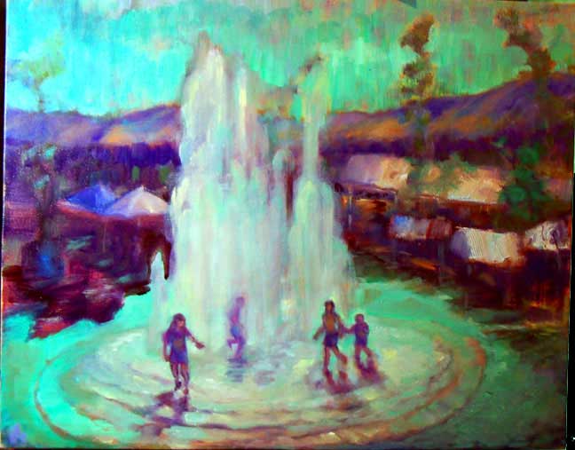 9" x 12" semi-absract oil painting "Mother and Child at the Plaza fountain, Los Gatos" by Riki R Nelson $275 |